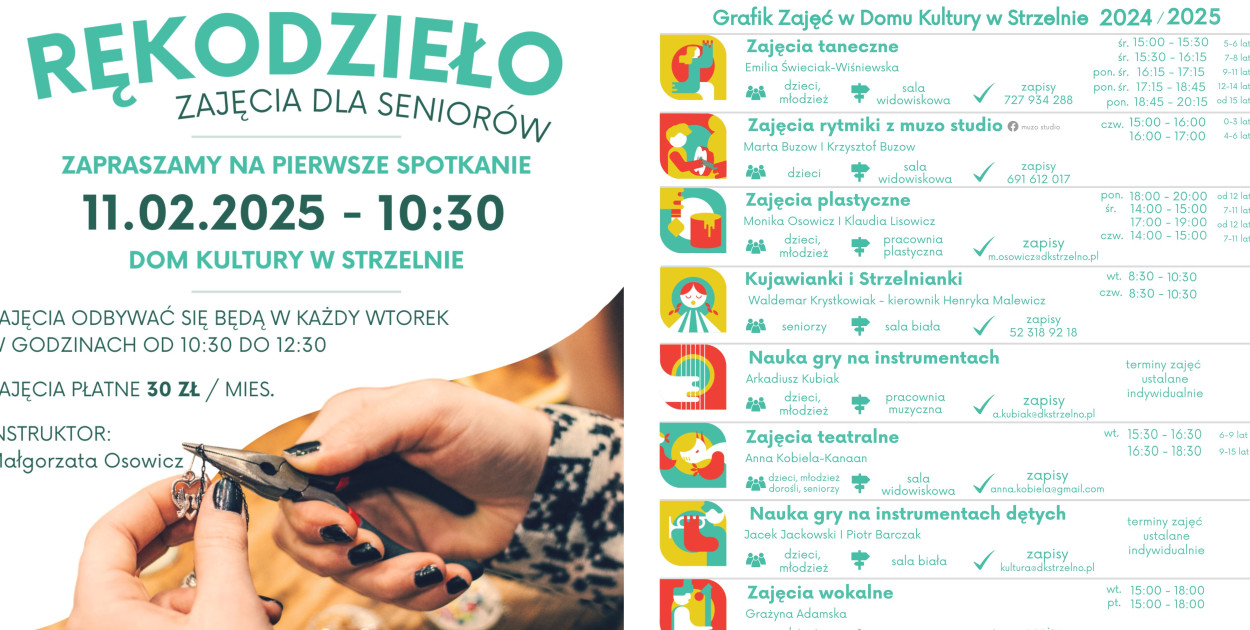 Nowością w ofercie są zajęcia z rękodzieła dla seniorów, których pierwsze spotkanie odbędzie się 11 lutego 2025 roku o godzinie 10:30. Warsztaty będą organizowane we wtorki w godzinach 10:30–12:30. Zapisy przyjmowane są telefonicznie pod numerem 52 318 92 18 oraz mailowo na adres [email protected]. Koszt uczestnictwa to 30 zł miesięcznie.