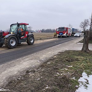 Jak informują druhowie z OSP Jeziora Wielkie, na jezdnię trafiły znaczne ilości wapna w wyniku awarii naczepy pojazdu ciężarowego. Obecnie trwają prace związane z usuwaniem ubitego materiału z nawierzchni.